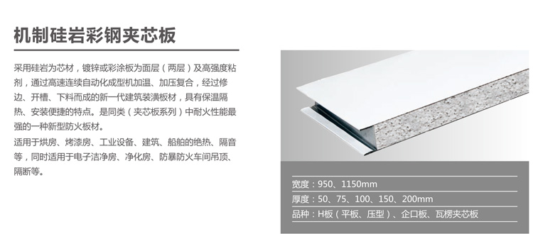 采用硅巖為芯材,鍍鋅或彩涂板為面層(兩層)及高強(qiáng)度粘劑,通過高速連續(xù)自動化成型機(jī)加溫、加壓復(fù)合,經(jīng)過修邊、開槽、下料而成的新一代建筑裝潢板材,具有保溫隔熱、安裝便捷的特點(diǎn)。是同類(夾芯板系列)中耐火性能最強(qiáng)的一種新型防火板材。