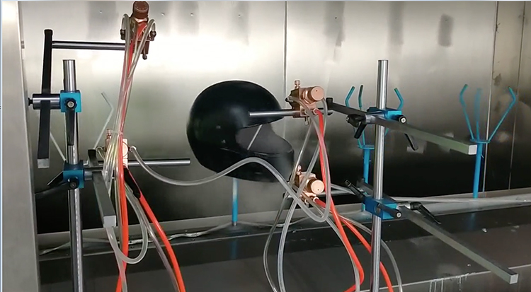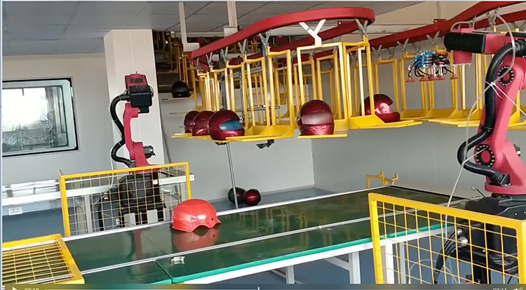 頭盔的生產采用塑料粒子經過高溫熔化,經過壓塑機的模具成型,然后經過冷卻、上架。這個是頭盔的成型階段,成型的頭盔都是一種顏色,但實際我們市場采購和銷售的頭盔都是五顏六色,有各色花系的,這個就是本文提到的后期自動噴漆線的工藝流程,下面詳細圖文介紹凈化噴漆線的作用及安裝實際案例介紹。